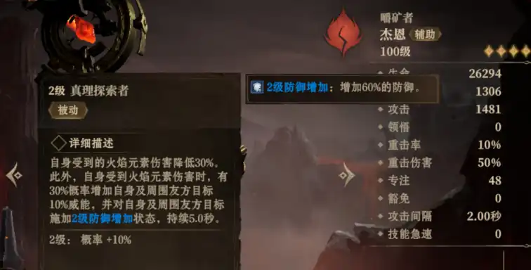 下面是杰恩的技能解析:首先我们需要知道杰恩的技能组合使其在队伍中扮演着重要的辅助角色,因此我们需要逐个的了解它的每一个技能,并争取做的详细掌握。最开始是被动技能:真理探索者:杰恩的被动技能使其在受到火焰元素伤害时,降低30%的伤害。此外,每当受到火焰伤害时,有30%的概率为自身及周围友方目标提供10%的威能加成,并施加2级防御增加状态,持续5秒,2级时防御会增加:增加60%的防御。