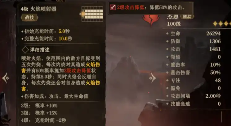 然后是战技:火焰喷射器:使用了这个技能,杰恩会释放火焰并进行喷射,对范围内的敌方目标造成五次灼烧伤害,每次灼烧造成50%攻击力和2%最大生命值的火焰伤害,并有50%概率施加2级攻击降低状态,持续5秒。同时,火焰会反噬自身,每次灼烧还会对自身造成20%攻击力和0.8%最大生命值的火焰伤害,同样的,技能可以升级。到2级的时候攻击力会降低:降低50%的攻击。然后是威能技:独家炸弹。这个技能会使得杰恩对范围内的敌方目标造成500%攻击力和10%最大生命值的火焰伤害,并减少其25%威能,并有75%概率移除其所有增益状态。这个技能有独特的伤害加成,主要作用于:攻击方面,以及对最大生命值的增益。