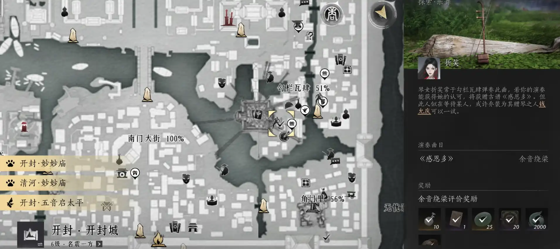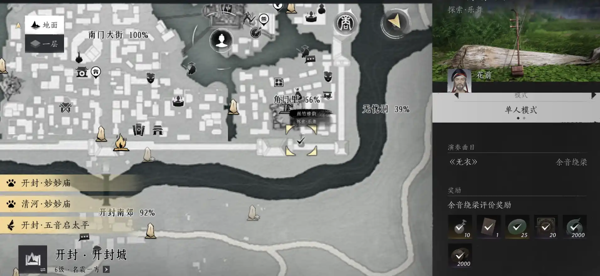 第三张乐谱隐藏在开封城右下角的角门里,需要玩家找到NPC花前。与花前对话后,完成一段《无衣》的演奏任务,就能顺利获得最后一张乐谱。这部分任务不需要特殊技能,只需按照提示进行操作即可。尽管获取过程看似简单,但需要玩家对开封城的地图足够熟悉,才能节省寻找时间。完成任务后,三张乐谱就正式集齐,玩家可以返回折笑处提交任务,解锁这把充满韵味的二胡。