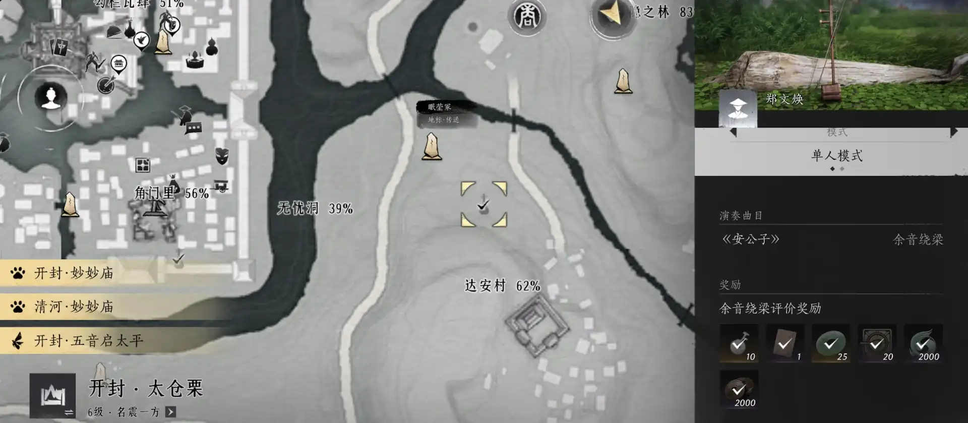 第二张乐谱位于达安村的眠莹冢传送点附近。玩家需要找到NPC郑文焕,并参与演奏安公子的任务。与第一张乐谱相比,这一任务的操作难度更低,主要是通过对话触发剧情推进即可完成。达安村的地形相对简单,大家只需根据地图指引找到这个位置,就能完成第二章乐谱获取的任务,就能够成功拿到第二张乐谱。这个任务的流程较为短暂,但情节设计非常贴合游戏的世界观,大家可以到游戏中试一试非常简单。