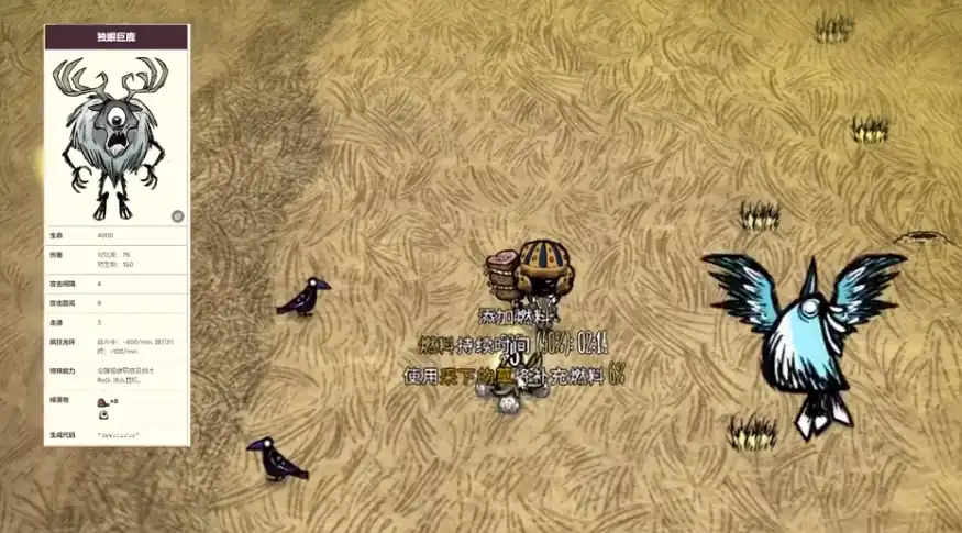 独眼巨鹿算是冬季中比较难打的首领boss,它有4000的血量,而且每次攻击能拿下75的血量还有冰冻攻击,如果新手玩家直接对上的话几乎没有任何胜算可言。因此建议玩家们在游戏中生存至30多天之后再来尝试挑战。
