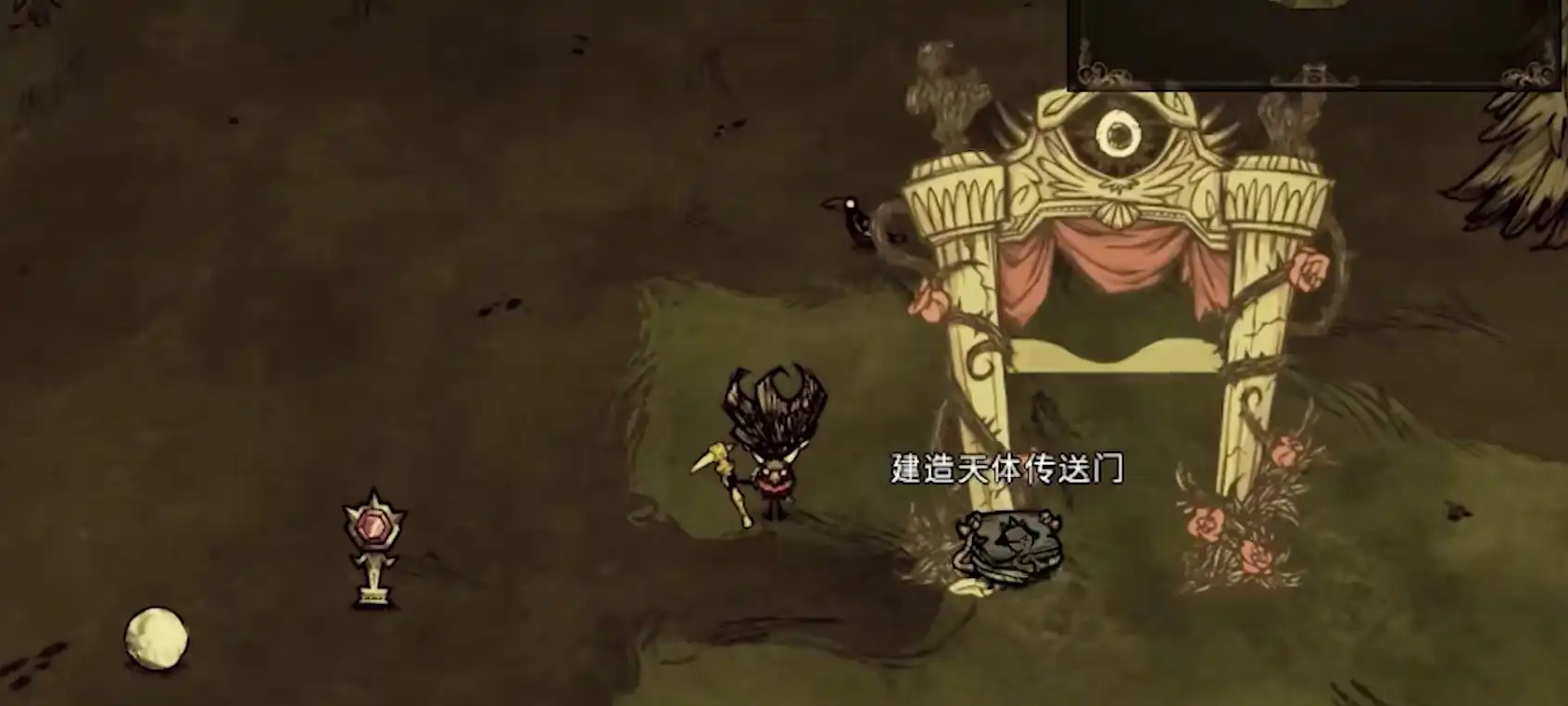 前往了指定区域后,就可以找一下出生的大门,这便是绚丽之门,朝着大门使用升级工具,点击建造中的天体传送大门即可查看具体的制作要求,把1个紫色月眼以及20颗月亮石放入到大门里,再点击按钮就能成功建造。有了天体传送门之后,就能让玩家再死亡后复活,不过复活后的最大生命值上限会有25%的损耗。想要不换档就更换角色的话,只要拿着月岩雕像对着天体传送门点击即可更换角色,这时候玩家身上的所有物品都会自动掉落。