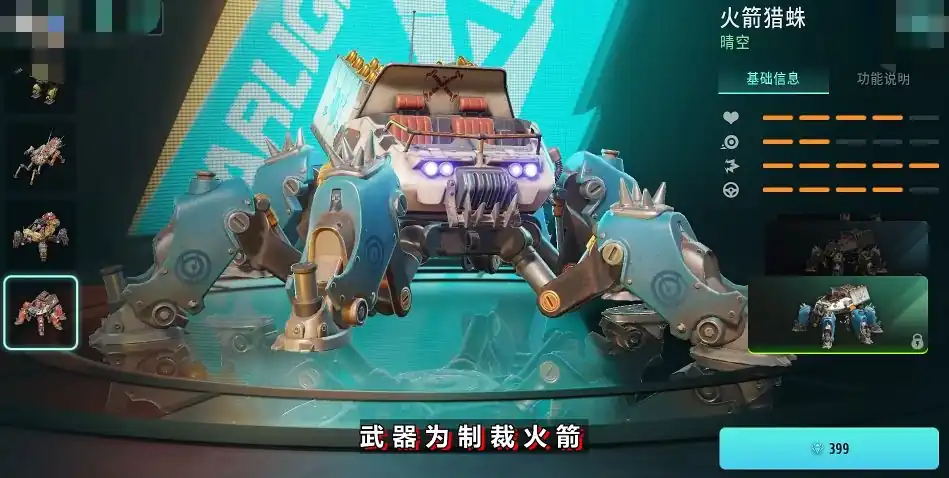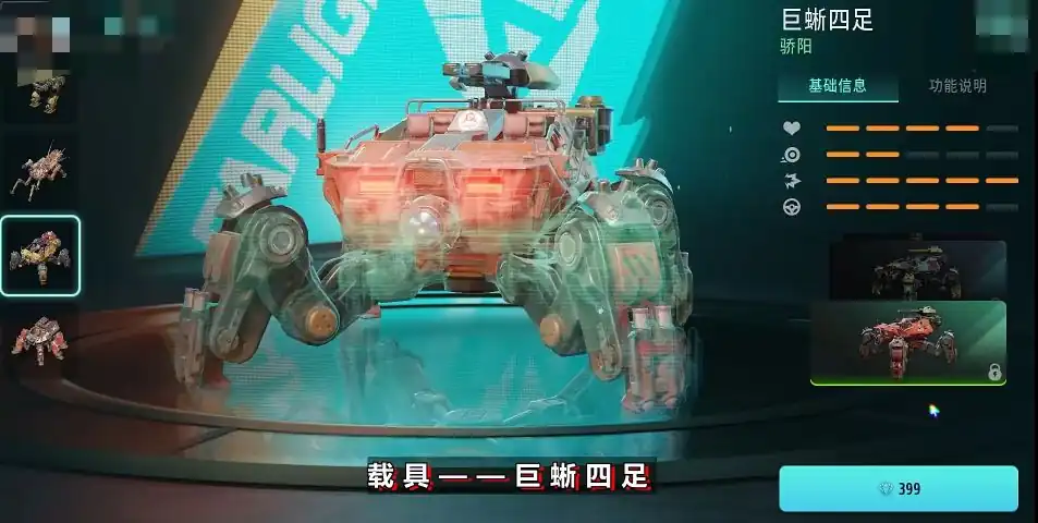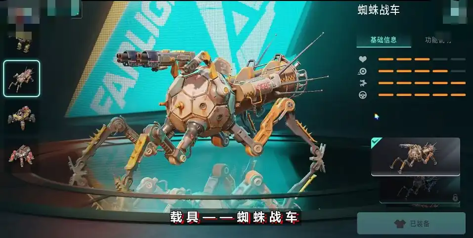 武器为充能激光炮,可以在蓄力一定时间之后增加激光炮发射的距离和威力,而技能也是和前面蜘蛛一样可以向上跳跃,射程虽然比较远,但是相对于前两个载具来说,移动速度比较慢。