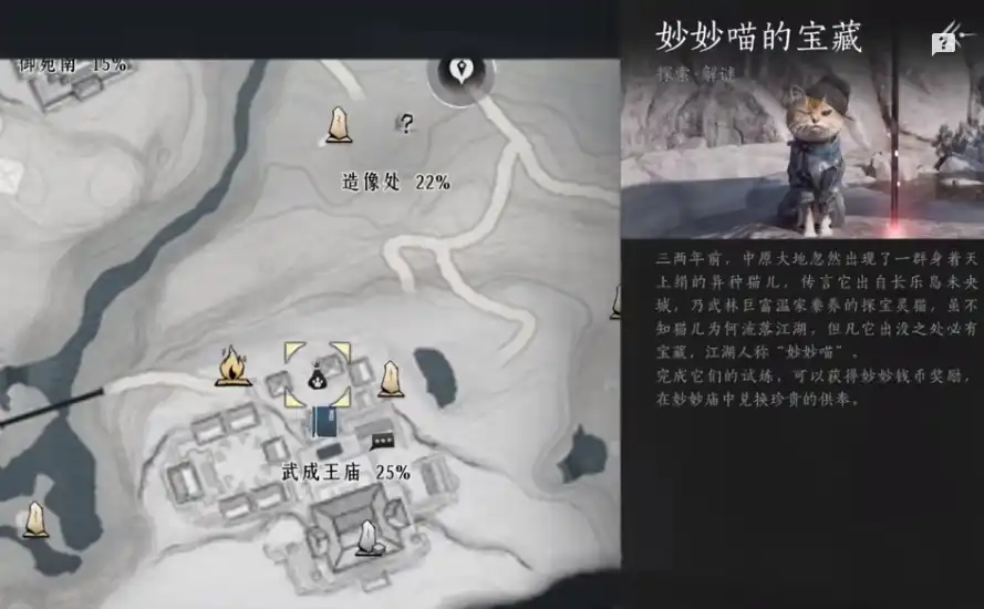 紧接着将游戏指引设定为详细指引,再不断放大地图,直到地图上能看到【喵喵】的表示,开封地图上有30多只的喵喵,找到它们每找到一个能获得30点的探索度。
