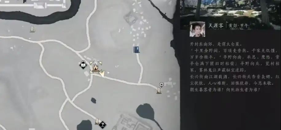 玩家进入开封之后,首先解决的就是主线任务。完成之后在地图上找到如图所示的天涯客表示,在开封地图上找到这三个天涯客并点亮,每个天涯客都会有100探索度的贡献;