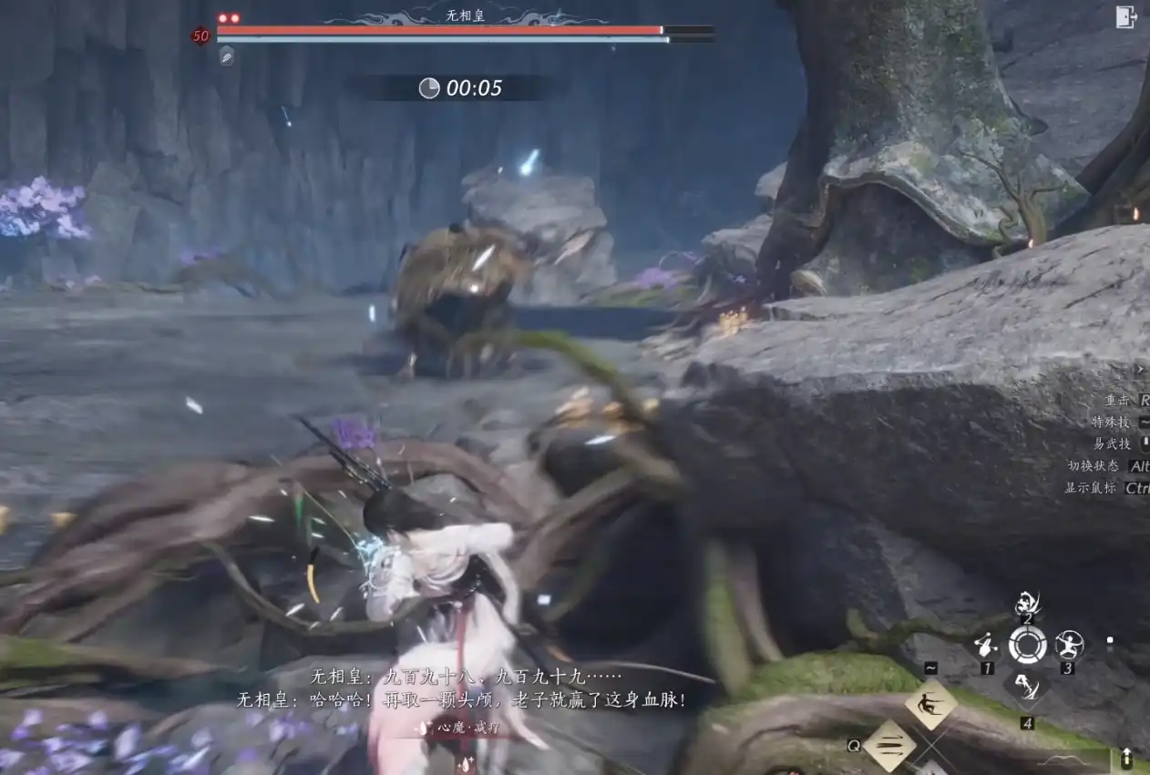 如果你希望通过更轻松的方式击败无相皇,可以尝试绕到BOSS背后,站在地图上的石墩上进行蓄力攻击。在这一过程中,利用枯木和水面的障碍物,可以有效躲避攻击,同时使用远程蓄力避免与BOSS的直接接触。只要保持蓄力并耐心等待,你就能够逐步磨掉BOSS的血量,最终完成挑战。