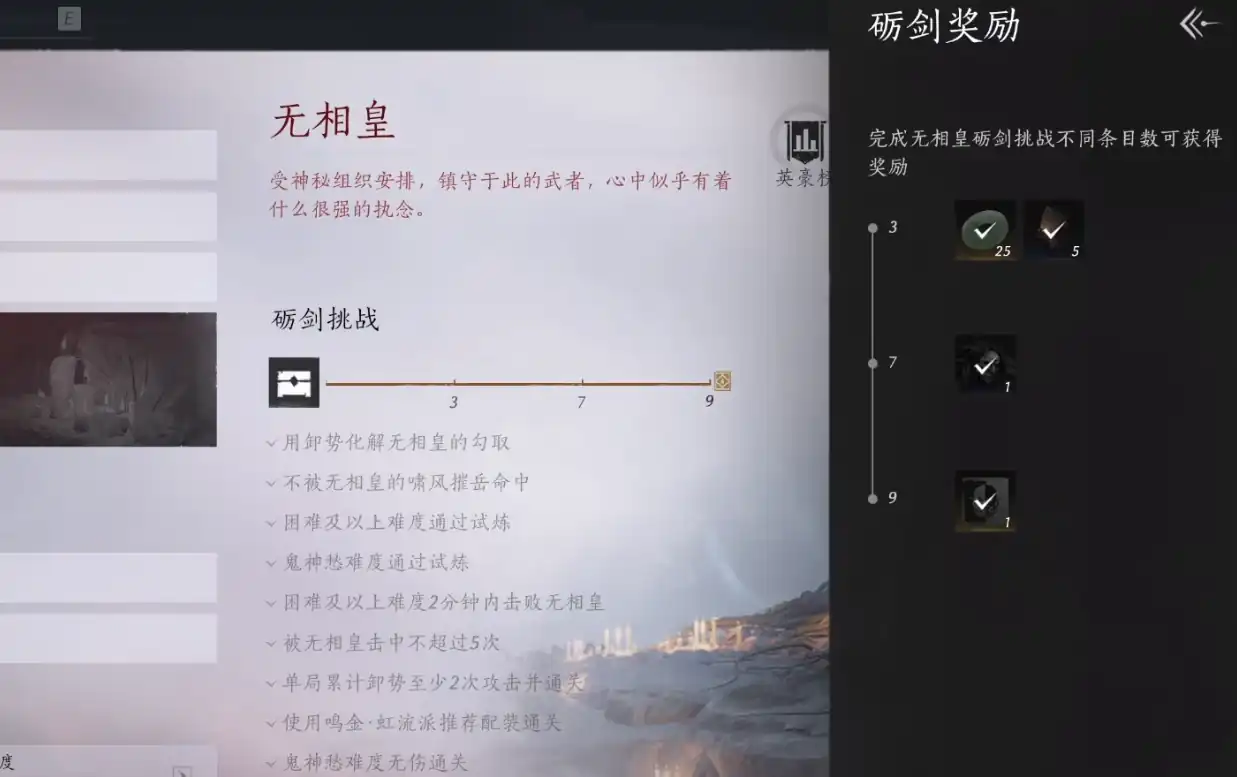 无相皇在砺剑挑战的寻心挑战里面,一共有9个试炼目标,不仅有长鸣玉奖励,还有试炼·无缺无相的徽章收集,因此推荐大家多刷做完砺剑目标。