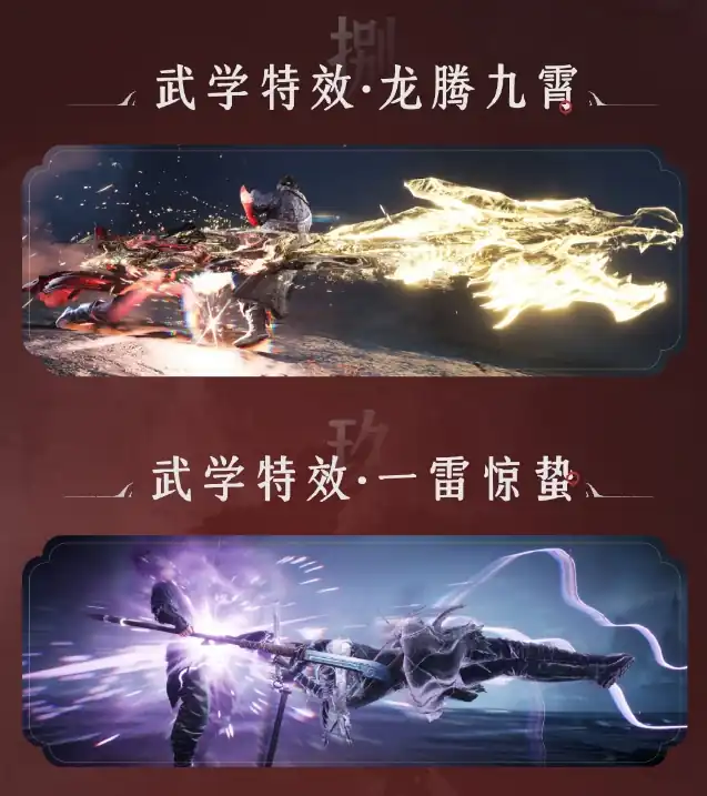3、武功特效。在新春活动中也推出了一些功夫的限定特效【龙腾九霄】、【一雷惊蛰】,这样玩家在新春活动期间在释放技能时还能看到神奇的效果;