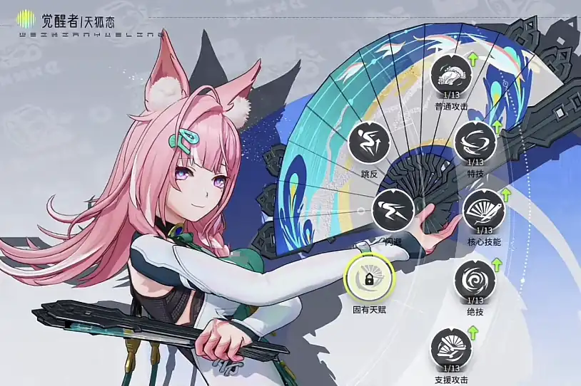 在各款游戏当中狐狸造型的角色都有着很高的人气,而天狐恋亦是如此,她是一个有着粉色长发的狐形美少女。天狐恋在游戏中的固有天赋名为“天生偶像”,当天狐恋进入到演出状态的时候或者是收回应援扇时,便能得到20%的普通攻击伤害提升,持续5秒时间。