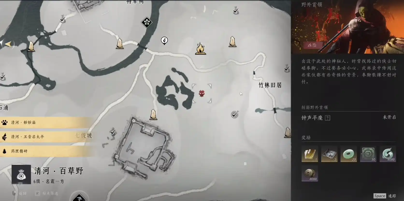 前往清河百草野:首先,打开地图并放大,寻找位于清河百草野区域的七伐坡和竹林旧居之间的位置。