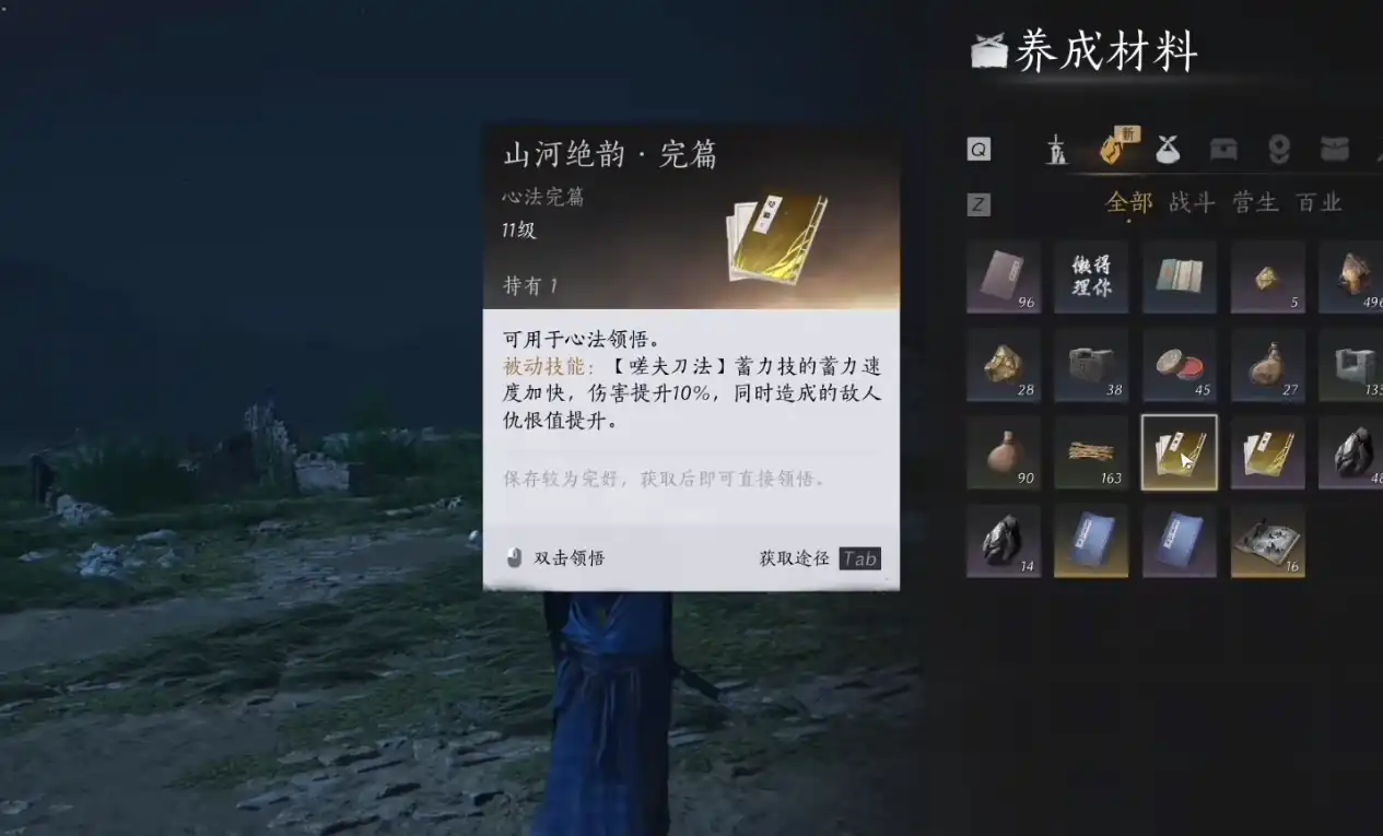第三阶段:在最后阶段,皮影师的攻击频率和伤害都会大幅提高,因此务必注意走位并时刻关注自己的血量。击败BOSS后,你将获得山河绝韵心法。在包裹里面,双击领悟即可。