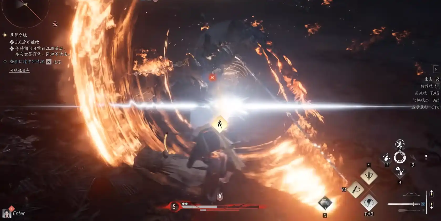 接着,叶万山会重新骑上马,冲向玩家,这时可以利用屏幕中央的光防进行反击。如果反击成功,你就能打掉他的血条。不过任何时候,当boss放红光的时候,就不要移位置,因为系统判定的是之前的那个位置,如果乱走位的话,反而会吃到更多的伤害。
