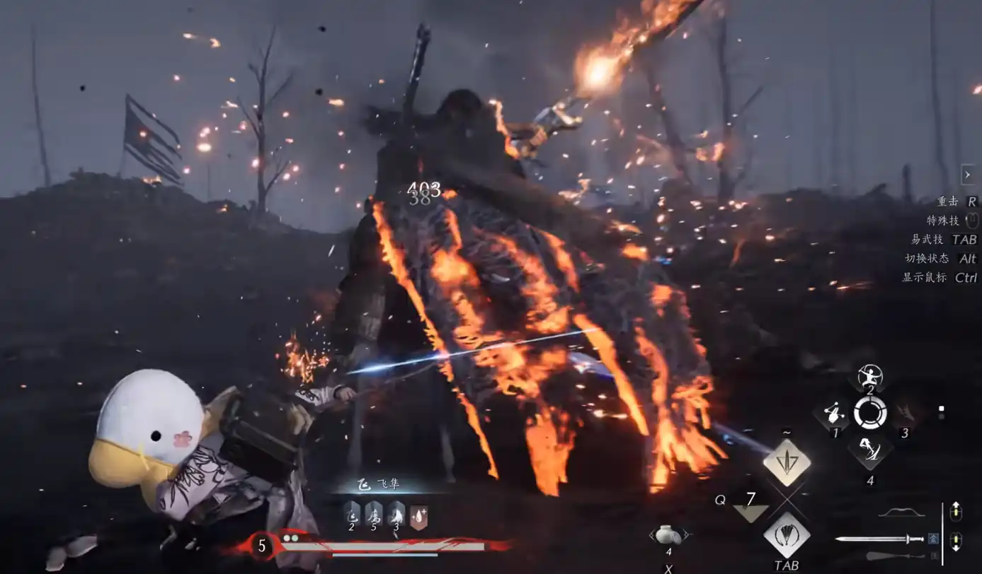 进入战斗后,开场叶万山作为将军的身份,他会骑马进行攻击,他的攻击方式相对固定,最典型的是四下劈砍的招式。当叶万山劈砍到第四下时,动作会特别慢,玩家可以通过闪避或格挡避开。