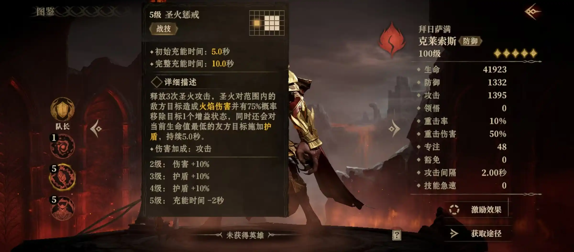战技圣火惩戒,连续释放三次圣火攻击,对前方范围内的敌方目标造成火焰伤害,有75%率将目标身上的一个增益状态移除,同时对我方生命值最低的目标添加护盾,自身添加的护盾就具有了被动的效果。大招黄金之威,将敌方目标身上的所有护盾移除,并造成火焰伤害,75%几率施加二级攻击降低,能够削弱对方50%攻击,同时对所有我方目标施加护盾,持续10秒钟。这就是一名可以为队友添加护盾,并将消失的护盾转化为治疗的英雄,大招还能够将敌人护盾移除并降低攻击,所以团队能力非常强。