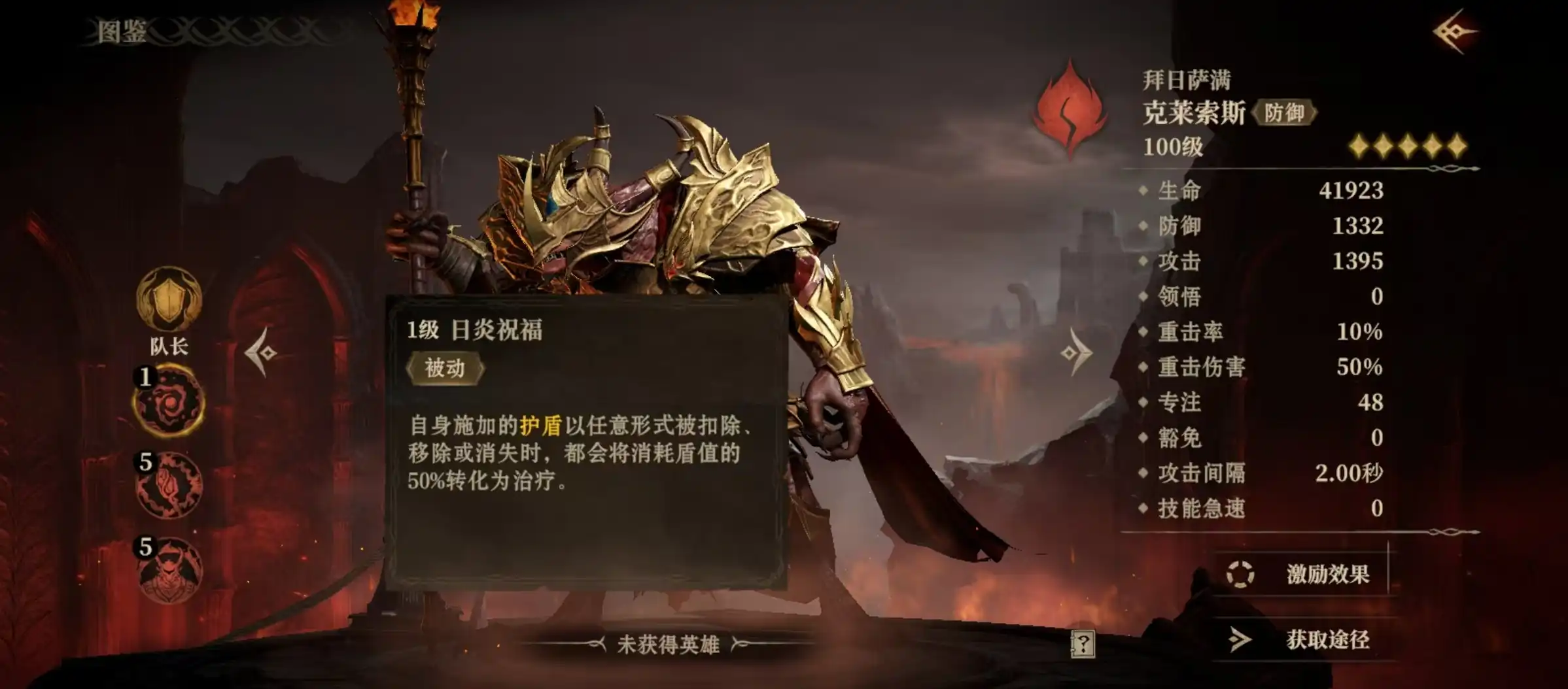 如果拜日萨满克莱索斯作为队长,那么队友将获得一级防御光环,但只有在历练之域战斗中才能生效,提升45%防御,所以大多数时候并不是队长的人选。被动技能日炎祝福,自身施加的护盾消失的时候,会将消耗的护盾值50%转化为治疗,也就是护盾无疑问是时间到了,或是被对方移除,或是被对方击破,都会转化成治疗。这样护盾就有了后续的额外效果,也算是对团队的加强。