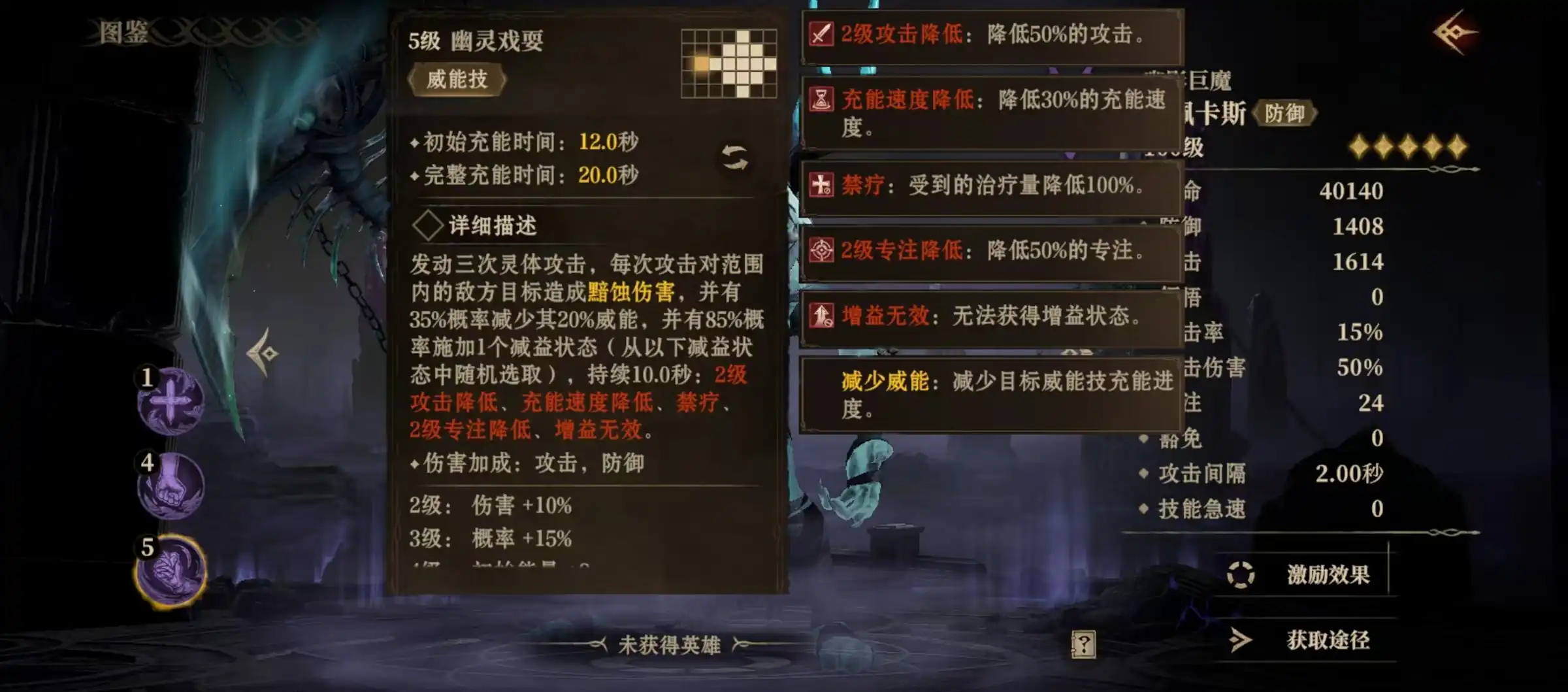 大招幽灵戏耍,施法范围很大,发动三次灵体攻击,对敌方目标造成黯蚀伤害,有35%几率减少对方20%威能。有85%几率施加一个减益状态,该状态并不是固定的,而是随机选择。主要包括二级攻击降低、充能速度降低、禁疗、二级专注降低、增益无效等。这些效果中,二级攻击降低,能削弱对方50%攻击力。充能速度降低,能降低对方30%充能速度。禁疗,是指受到治疗量降低100%。二级专注降低,能消弱50%专注。增益无效,使目标无法获得增益状态。