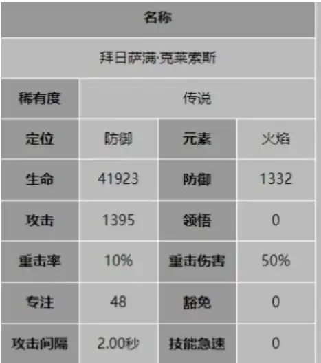 克莱索斯的技能解析,首先是防御光环(队长技):在历练之域战斗中,提升所有友方目标45%的防御。然后是日炎祝福(被动技):自身施加的护盾以任意形式被扣除、移除或消失时,都会将消耗盾值的50%转化为治疗。其次是圣火惩戒(战技):释放3次圣火攻击,每次对范围内的敌方目标造成100%攻击力的火焰伤害,并有75%概率移除目标1个增益状态。同时,还会对生命值最低的友方目标施加相当于其最大生命值15%的护盾,持续5秒。以及黄金之威(威能技):移除所有敌方目标的护盾后,对其造成500%攻击力加10%最大生命值的火焰伤害,并有75%概率施加2级攻击降低状态,持续10秒。随后,对所有友方目标施加相当于其最大生命值25%的护盾,持续10秒。