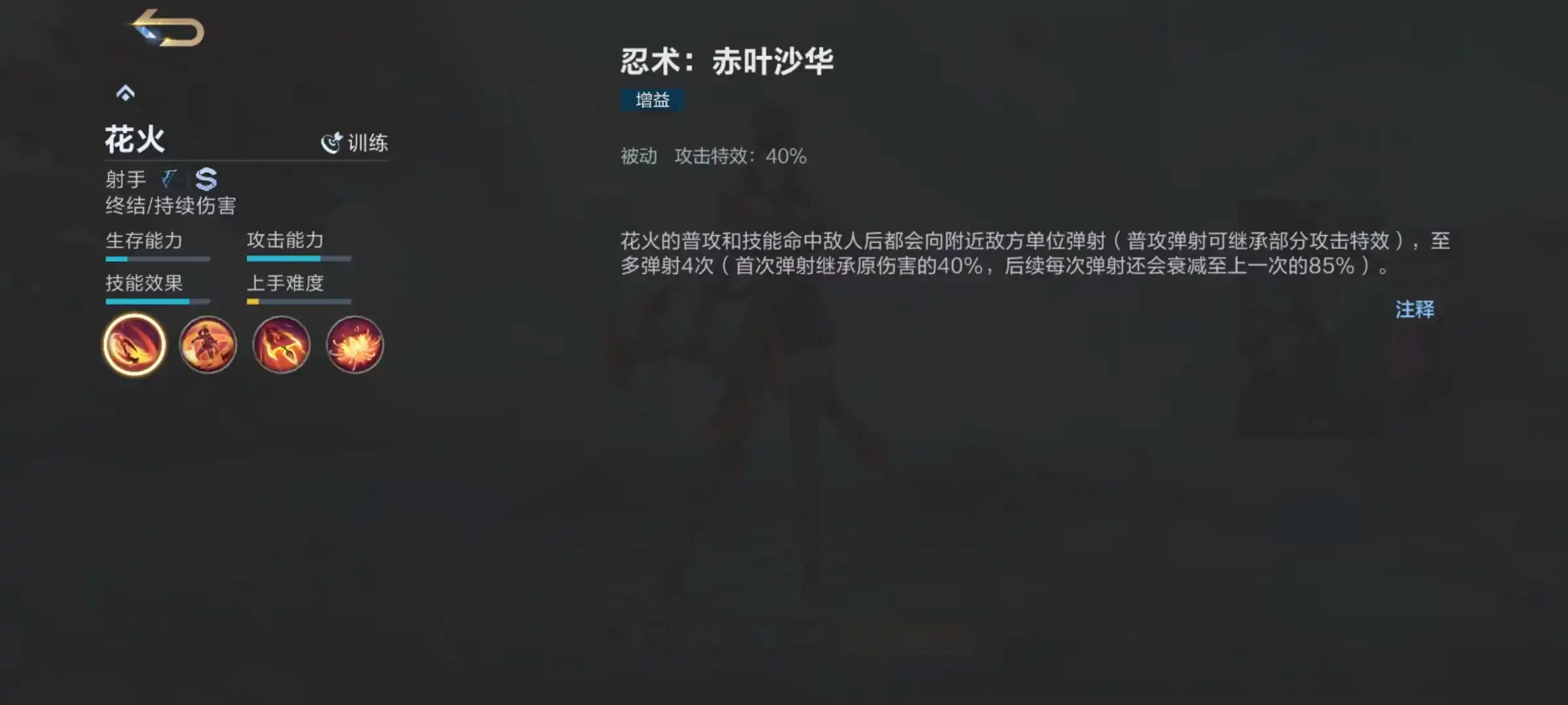 决胜巅峰中的英雄是比较简单的,除了一个被动之外,另外只有三个主动技能。花火的被动是普攻和技能命中敌人都会产生弹射,最多弹射4次,利用好这一效果,可以在线上很好的消耗敌人以及快速清理兵线。但是要注意,清理的时候,自身的位置千万不要太过靠前,这样容易被对方抓住。
