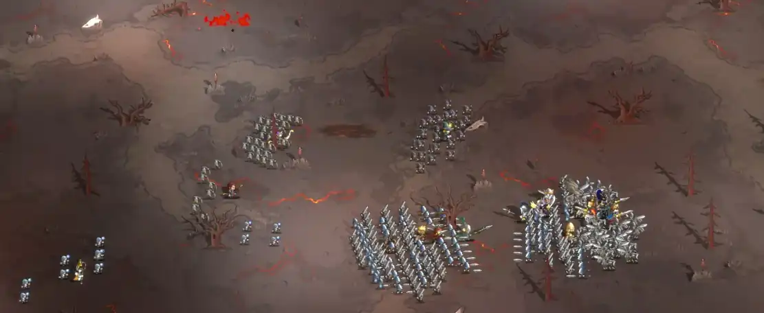 高质量的2d美术,q版画风,2.5d视角,颇有同年代作品的独特韵味。主界面风格简洁明了,ui设计质感突出,给人一种单机独立游戏的既视感。战斗表现尤为出色,场景设计极具视觉纵深,摄像机位置固定却不显呆板。同屏可容纳数百单位的激烈战斗,为玩家带来极具冲击力的军团大战视觉盛宴,有一种手机版“全战”的感觉。