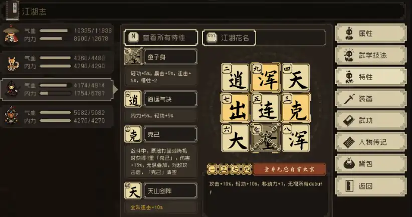 童身功和浑行无穷正象天这两特性能组合在一起,形成“童身无忌白首太玄”这一全新特性,加10%攻击力,轻功属性加10%,移动力加1,并且可以无视所有的负面效果。