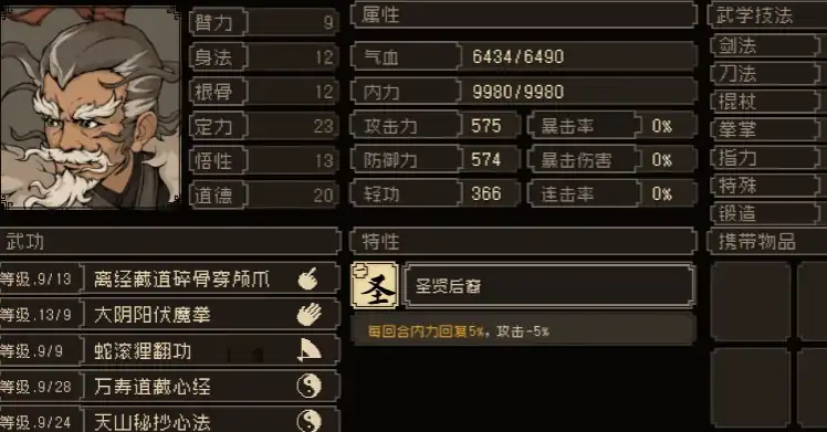 如果将出手式和白猿惭剑组合在一起,还可以得到特性“神招乍现白猿惭剑”,提升20点的剑法伤害,攻击力加10%,暴率加30%,暴伤加125%,如果喜欢玩剑法的话,这个特性组合的收益很大。此外“一通百通”+“狂风浪潮劲”可以得到“北孤隐世动”,剑伤加20点,10%攻击,5%连击率,20%特殊武学伤害提升。