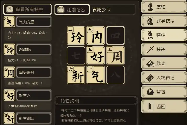 大家玩武侠题材游戏的时候经常会有天赋、特性的设定,不同的特性可以给到不一样的加成,进而改变玩法套路,大多时候特性是独立互不影响的。但是这里却可以组合,大江湖之苍龙与白鸟特性组合是一种新的设定,指定几种特性可以组合在一起形成新的专属特性,感兴趣的不妨来看看吧!