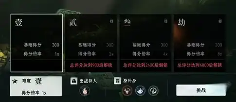 每个章节会包含四个不同的难度,分别是壹、贰、参、劫,玩家在挑战每个章节的时候,可以选择一位异人以及最多3个身外身技能进行出战,每场战斗胜利后,系统会根据难度和通关花费的时间来计算评分,具体来说难度越高花费时间越短,分数就会更高,需要注意大家可以更换三位异人不断挑战,最后分数为三位异人最高分数的总和。
