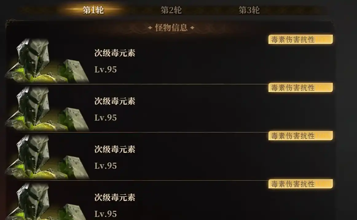首先到第二张地图,塔防变得难打的原因是因为元素抗性的怪物,大家可以看下图的第一轮全部都是毒素抗性拉满的怪物,这就意味着我们上毒属性英雄打它们,怪物不会受到一点的伤害。