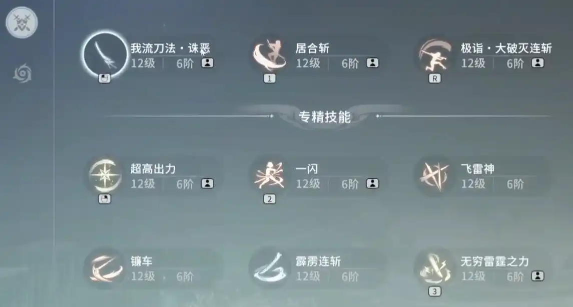 如果是月刃流太刀侠(即镰刀侠),也是要点开三阶天赋树才能玩的,是通过消耗雷印召唤月刃进行持续输出,装备的词条中像是幸运、急速、精通、暴击,这些都是比较侧重的。精通能提升月刃的伤害,暴击可以吃到暴伤的增益,幸运则是在触发幸运一击打出双倍伤害的同时,还会额外给月刃提供加成。急速则是提升月刃的攻速。词条分配方面最好大到60%幸运、45%急速、45%精通。