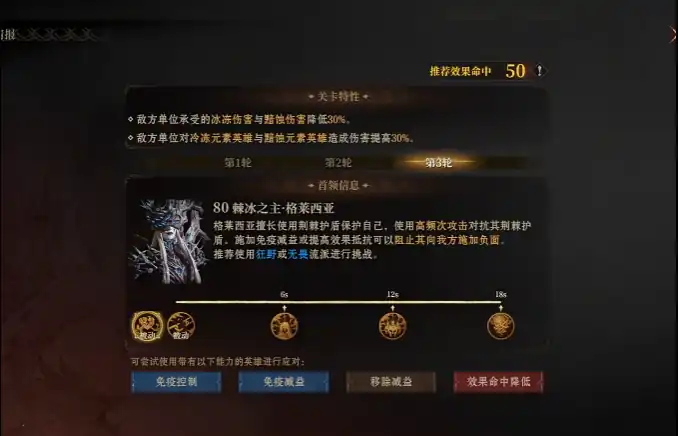 随着这个本难度的提升,BOSS对同属性阵容克制的数值也在不断提升,该BOSS是针对冰黯蚀属性的英雄,也就是说BOSS受到的冰冻伤害和黯蚀伤害会降低30%,而反过来该BOSS对黯蚀英雄和冰元素英雄伤害会提高30%。