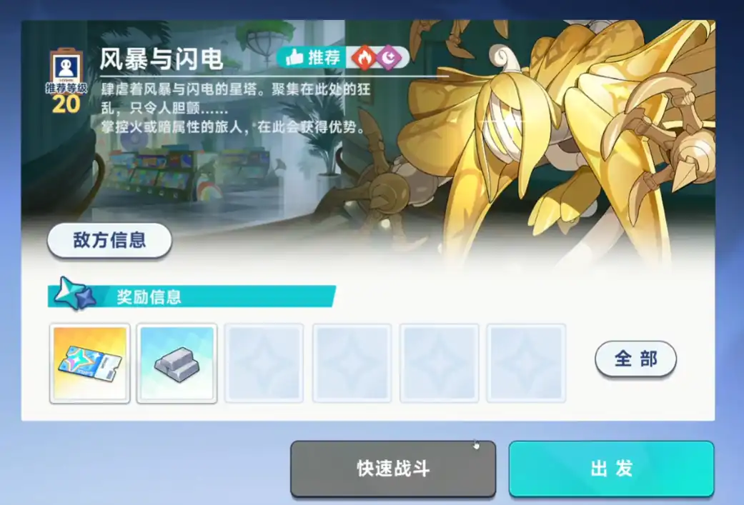 首先风暴与闪电是一个20级的副本,所以大家的全队人员最好都升到这个等级。另外他比较畏惧火属性以及暗属性的角色,所以大家如果条件允许的话可以全部上阵火属性的队员。你就能获得伤害上的优势,即便自己的操作略水,依然有信心过关。