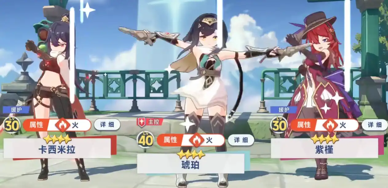 由于该关卡比较害怕火属性攻击,朋友们可以选择卡西米拉+琥珀+紫瑾的阵容。因为他们全部都是火属性角色,在阵容方面可以先天压制对手。而且可以操控手中的枪不断释放火属性攻击,自身灵活性也很强,带有一定的支援能力,轻松解决眼前的怪物。