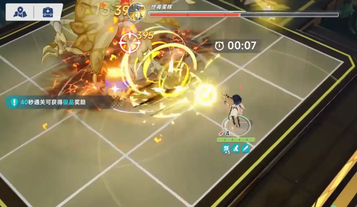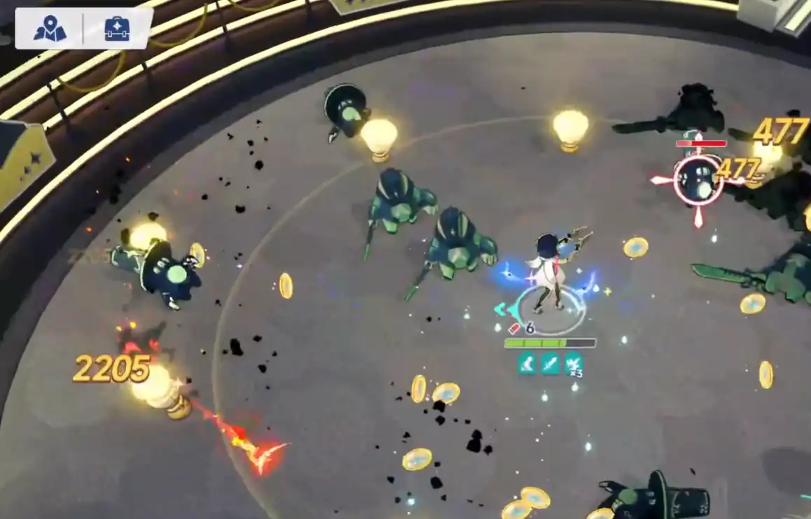 进去之后我们只需要不断移动,然后操控角色攻击眼前的小怪就好。最后选择可以提升我属性伤害的buff,就可进入下一个关卡。到了第二层迎面而来几个小怪,我们可不断移动并射击。然后将支援队友召唤出来,因为后面又有个两个大型的怪物,这时要集中火力将他们消灭。