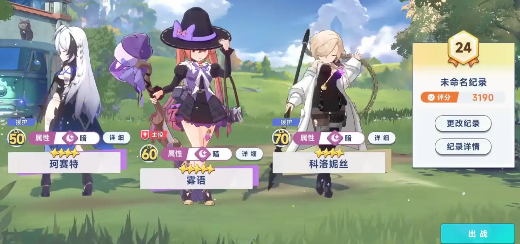 主控角色:雾语(五星稀有度,暗属性)、援护角色:珂赛特、科洛妮丝。