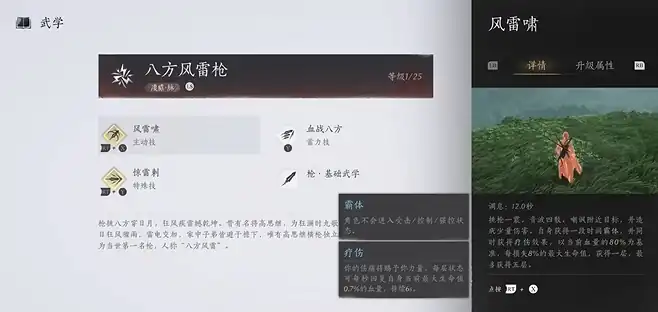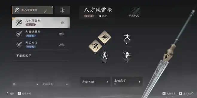 八方风雷枪法则更加注重防御与生存能力,被定位为承伤类武学,适用于那些愿意站在前线上挡下敌人进攻,同时对敌人造成伤害的玩家。八方风雷枪法的技能如下: