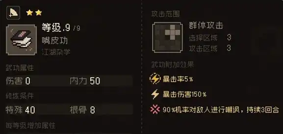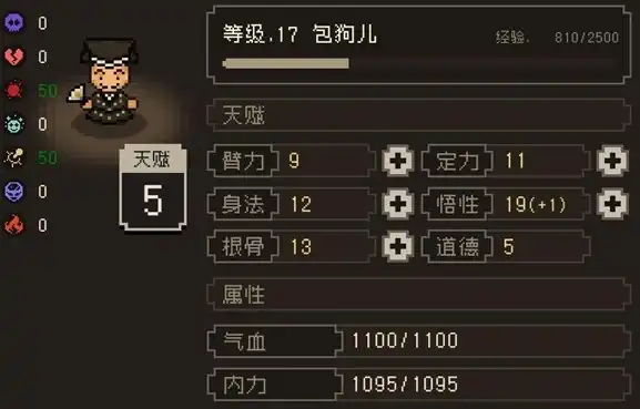 包狗儿可以根据奇门高的特点来学习奇门遁甲,学会后奇门点数可以到达120点以上,基本上中后期碰到的谜题机关都能轻松解开,在探索中是个不错的辅助角色。而悟性高的特点,可以用来学习儒家系的功法,增强自我恢复能力和部分抗性,而且血量的上限也会相应提升不少,这样后期能够减少被秒的风险。但是由于他本身是个江湖浪荡子,所以定力上是比较低的,需要提升定力属性来防止他在战斗中乱跑。
