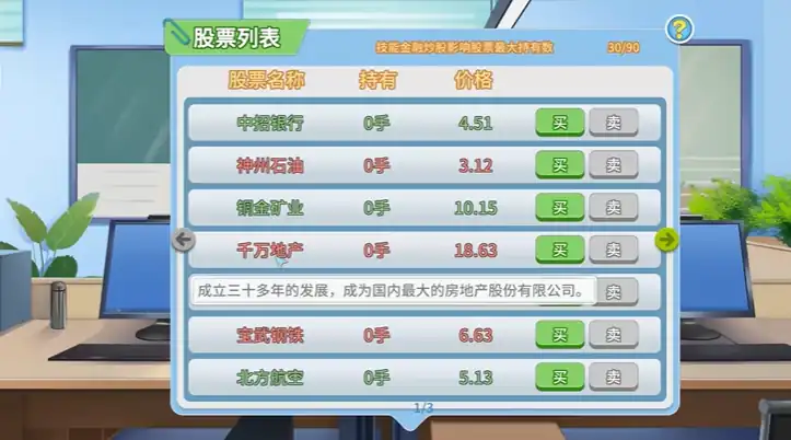 今天带来的是职场浮生记怎么炒股,在职场浮生记中,炒股系统是玩家实现财富增长的重要途径之一,同时也是一项极具策略性和风险挑战的玩法。游戏中的股市仿佛一座虚拟世界的缩影,既有牛市的高涨激情,也有股灾的突如其来。玩家不仅需要在职场中打拼,还要具备敏锐的商业嗅觉和冷静的风险判断,才能在波动的市场中找到自己的投资节奏。