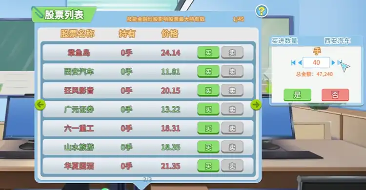 进入炒股系统之前,玩家需要首先积累一定的启动资金。初期的工资收入虽然有限,但通过合理规划日常消费和完成额外任务,玩家可以逐步积累足够的资金迈入股市。游戏中提供了多只股票供玩家选择,而每只股票的价格波动都受到市场趋势和特定事件的影响,在某些剧情节点,部分股票可能会受到政策利好或行业爆发的推动而大幅上涨,而另一部分股票则可能因市场危机而迅速下跌。