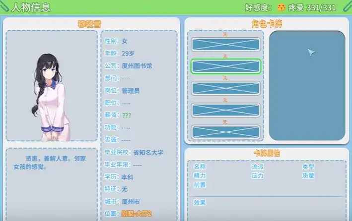 在关系逐渐深入后,玩家会解锁她的约会剧情,这些场景设置精美且富有情感张力。比如,在某次约会中,玩家可能需要带她前往高档餐厅或参加艺术展览,而选择普通场所可能会让她失去兴趣。玩家通过与她的深入对话,可以逐渐探知她的真实想法,并进一步了解她的性格特点。关键剧情如购买钻戒、彩礼任务等,虽然需要一定的经济积累,但完成后可以显著推进情感线的发展。玩家需要在游戏中合理规划资源,为这些剧情做好充分准备。