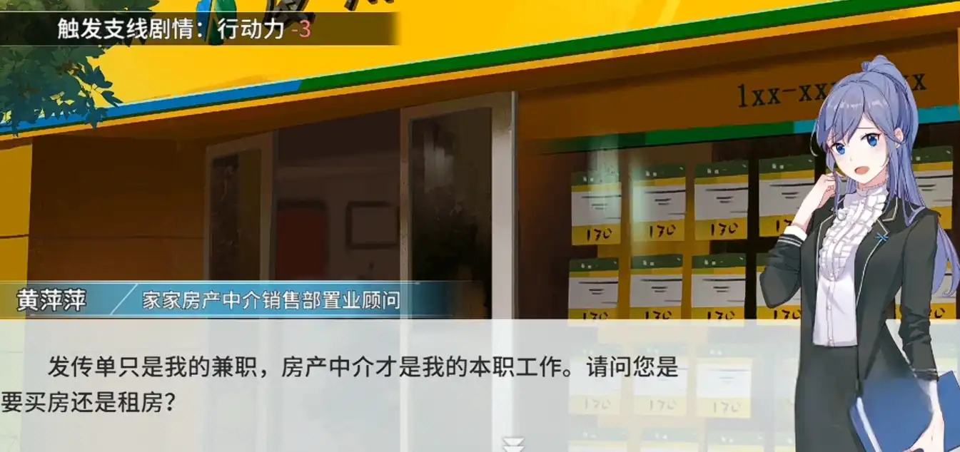 黄萍萍是游戏中另一位带有强烈个人奋斗色彩的角色。她的成长背景与赵梦圆、陈子澄截然不同,出生于一个贫困家庭的她,从小生活在重男轻女的环境中,但她并未被家庭的偏见压垮,反而选择通过自己的努力改变命运。作为一名房地产销售,她在第一年的一月份主动联系玩家,通过电话询问是否看房。玩家选择前往看房后,即可开启她的剧情线。通过与她的交流,玩家不仅能帮助她实现事业上的目标,也能在互动中感受到她隐藏在坚强外表下的柔软一面。