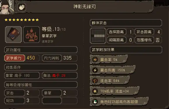 踏上无名岛时,四周的寂静如同一场无声的叩问,岛内的石碑分布隐秘且毫无指引。左侧的石碑,隐约散发出一种锐利的气息,仿佛有无形的拳风在周围游走。这块石碑对应的是拳法秘技【神影无锋刃】。想要解锁这门武学,玩家需要具备拳法属性大于180,身法大于28,且道德高于10的条件。这种苛刻的门槛,将许多初入江湖的侠客拒之门外,当条件达成时,石碑上的文字会忽然生动起来,仿佛有一道无形的拳意从中迸发,直击玩家内心。领悟【神影无锋刃】后,玩家将获得兼具速度与力量的拳法奥义,出手如疾风般迅猛,拳锋所过之处皆是敌人难以招架的虚空。