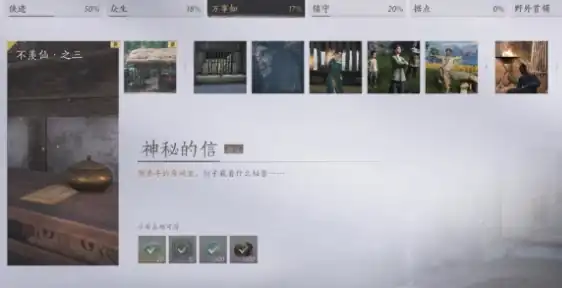 第二个任务名为神秘的信,玩家需要在清河地区的寒香寻的房间中找到一封陈年旧信,信中隐藏着一段不为人知的江湖秘史,玩家需要将其带回并交给天不收,完成任务后,玩家将获得10点探索进度。