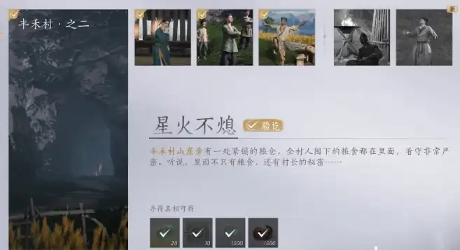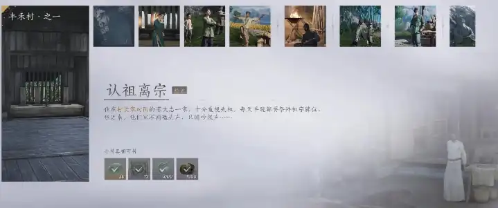 第五个任务名为认祖离宗,玩家需要在指定地点偷听一段对话,然后前往丰禾村完成任务,玩家需要巧妙地隐藏自己,避免被对话中的角色发现。偷听到的对话内容将揭示一段隐藏的家族秘密,玩家需要根据这些线索在丰禾村完成更多的任务。完成任务后,玩家将获得10点探索进度。
