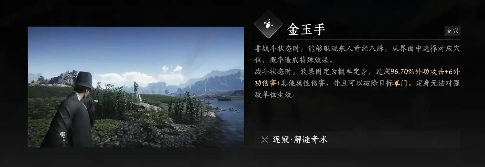 在战斗状态下,金玉手的效果更加实用。虽然这时候它的功能有所限制,只能让敌人定身,但这一效果足以成为你的制胜绝招。尤其是当它可以配合破除敌人罩门时,能让对手丧失真气回复能力,并附加额外伤害,威力非常强大。当然,面对那些游戏中的强力敌人,定身效果可能会失效,所以也需要合理运用。