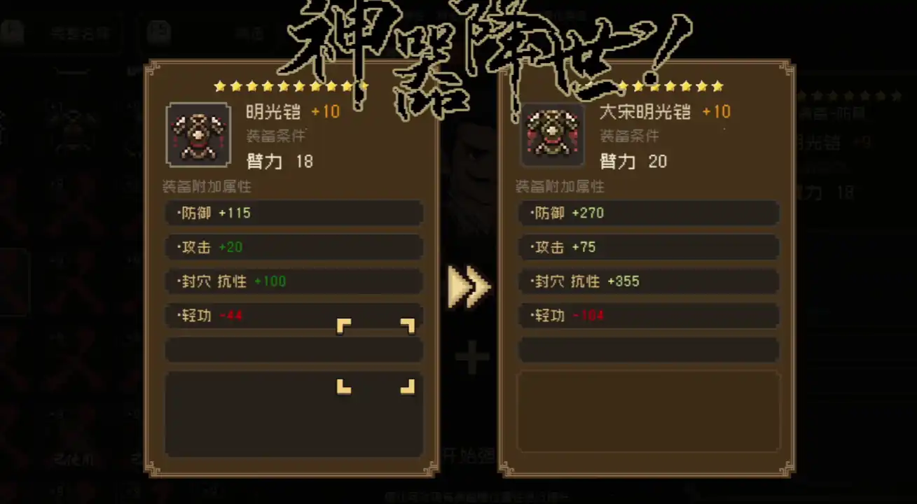 比较适合玩家使用的防御类圣器是明光铠,明光铠的基础防御数值是115点,它能够加成玩家的智力数值,还能够增强玩家的攻击数值,可以说是一个攻防兼备的装备了,在进行升级后,他可以进化成为大宋明光铠,附带有270点的防御数值和75点的攻击力加成,对封印的抗性,高达355点。