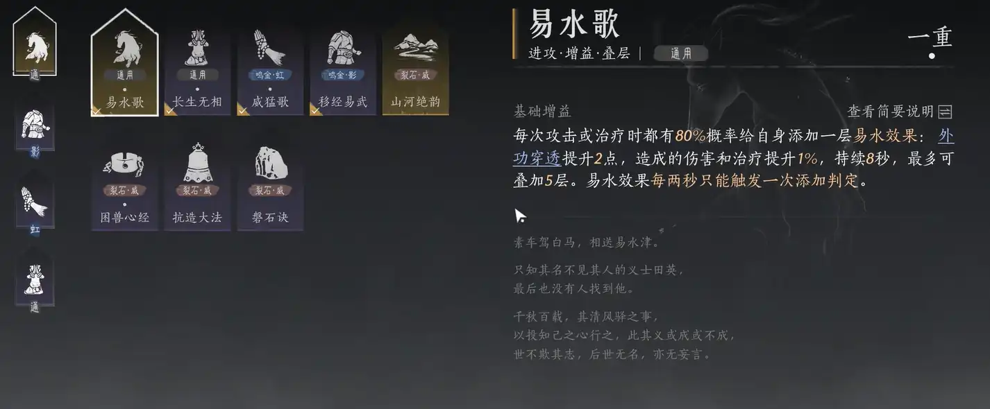 心法搭配方面,陌刀输出流的核心是爆发力,推荐优先选择易水歌或四时。易水歌能稳定提升爆发能力,而四时虽然覆盖率略低,但在特定场景下表现不错。除此之外,抗造、威猛歌和移经易武是三大推荐心法。其中,抗造提供稳定增伤,威猛歌和移经易武则优化输出节奏。需要注意的是,金色防御类心法并不适合陌刀输出流,这个流派的精髓在于防御靠走位。