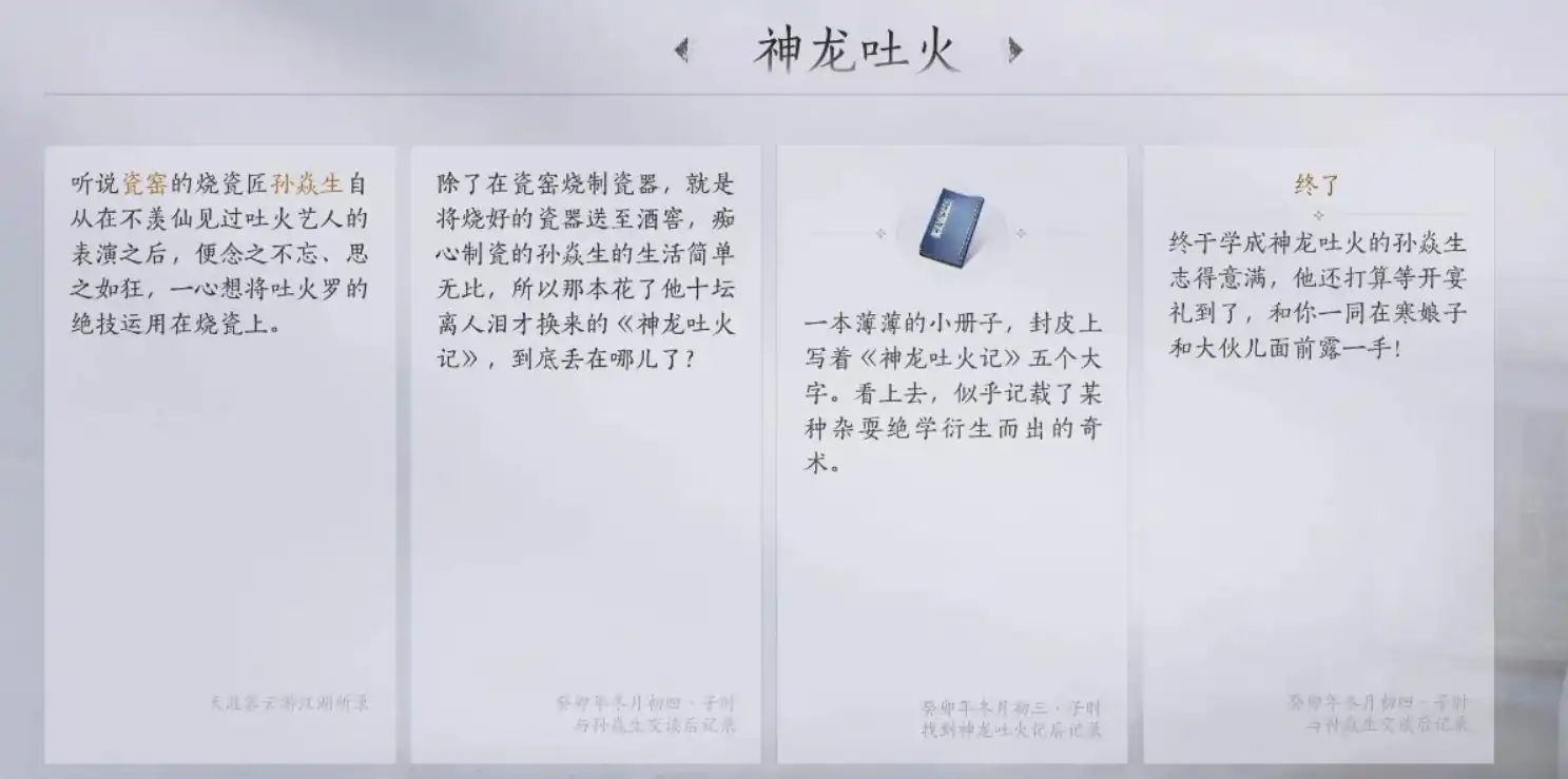 拿到技能书后,我们需要赶紧返回“瓷窑”找孙焱生复命。他会对你表示一番感谢,同时,这一奇术的获取过程也就完美收官了。“神龙吐火”不仅名字霸气,实战中也非常实用,喜欢用奇术打出高爆发的玩家千万别错过。