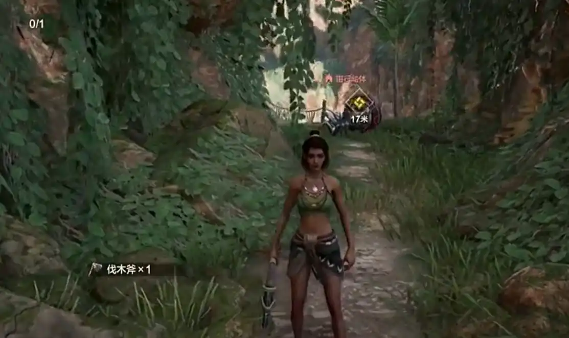新手先不要着急挑战他,可以沿路收集木材和石头,在第一个任务点制作一把斧头,这是我们的第一个工具以及武器,做好后将周围的椰树给砍倒,需要注意在砍树时要及时躲避倒下来的树桩,避免造成不必要的伤害。