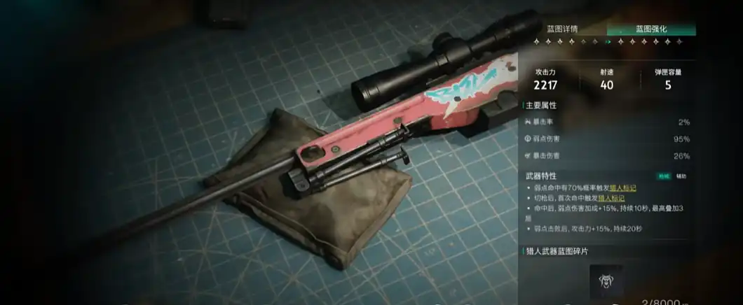 这把武器的品质很高,是一把金色的狙击枪,数据面板上攻击力达到了316,虽然说它的射击速度比较慢,弹匣容量也没达到理想的数值,但是这个武器命中目标弱点时,有70%的概率给敌人添加狩猎标记,这个特性带来一个效果,就是在切换武器,或是首次命中时触发,弱点伤害会有15%的加成,如若获得,必然是要培养的,输出力度很是强悍。