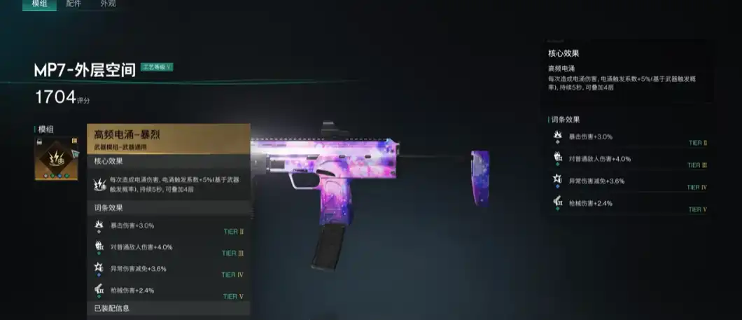 这是一把元素冲锋枪,在该类型的枪械当中也是顶尖的存在,攻击力达到33,射击速度850,弹匣容量35,属性上看可能并不是多么的突出。但是优势在于其特性,命中对手后与偶25%的概率触发电涌,击败敌人,或者换弹时直接将概率提升到100%,而且它和腐蚀不同,它能让敌人进入电涌异常状态,一枪下去基本都是可以将这个效果触发的,这种概率的情况下,也是十分顶尖的存在,当然要收入囊中。